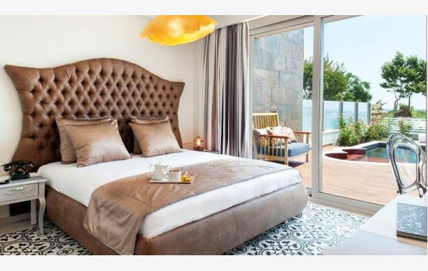 Junior Suite Sea View with Private Pool - oko 35m2, ovaj apartman obezbeđuje udobnost I pogodnost za putnike, iz sobe se izlazi na prostranu terasu sa privatnim bazenom I pogledom na Egejsko more.