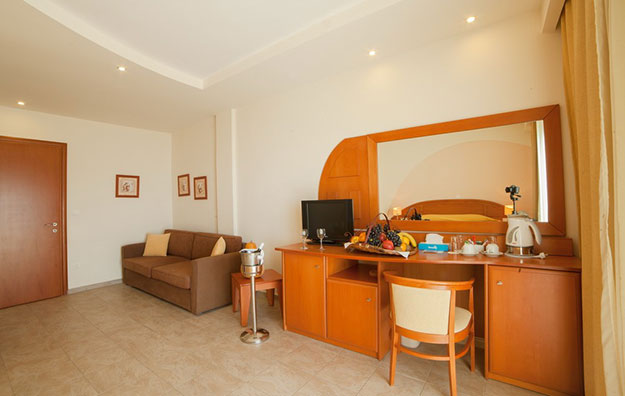 Superior porodična soba sa pogledom na more : oko 50m2, opremnjena je sa 4 singl ležaja I sofom ili sa 2 francuska ležaja I sofom.Namenjena je za 4-5 osoba.