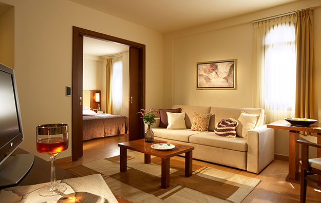 Deluxe suite garden view-42-53 m2, pogled na vrt, sa dnevnim boravkom i odvojenom spavaćom sobom u jednom ili dva nivoa (mezoneta), pogodan za 2-4 osobe.