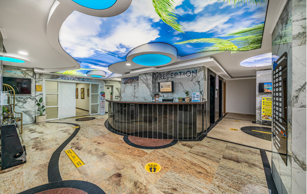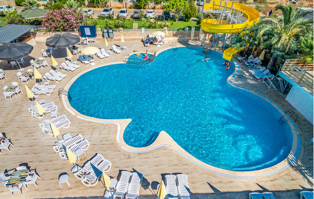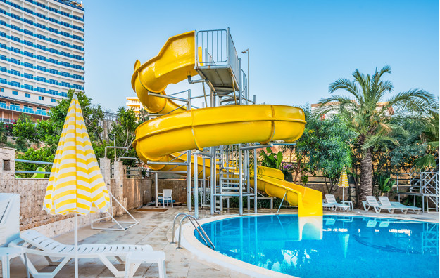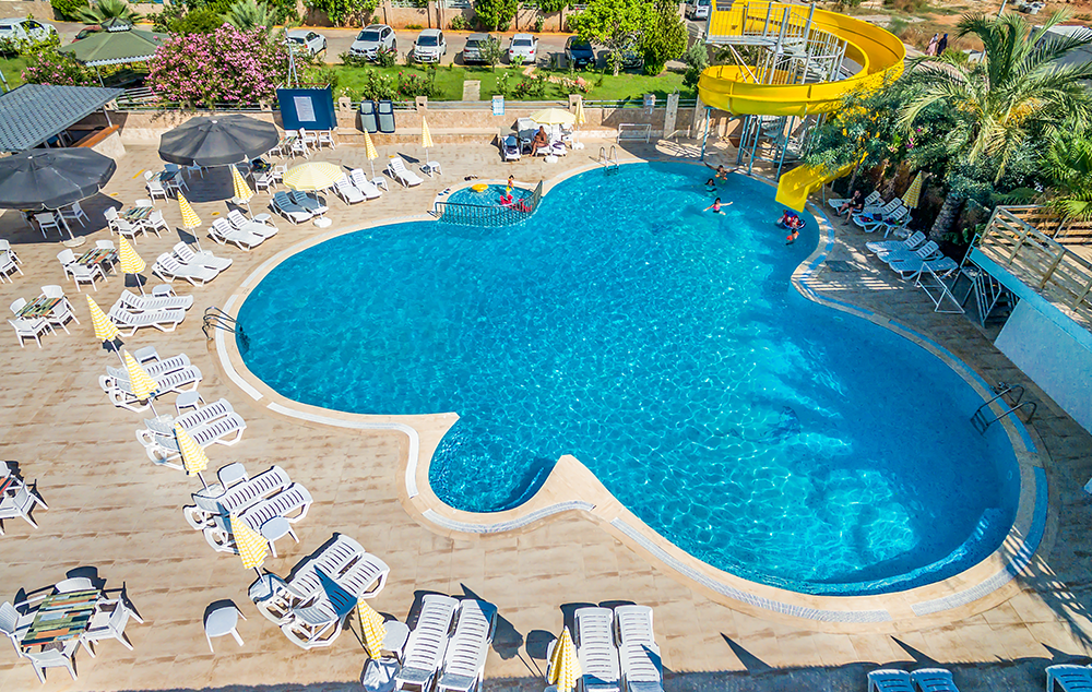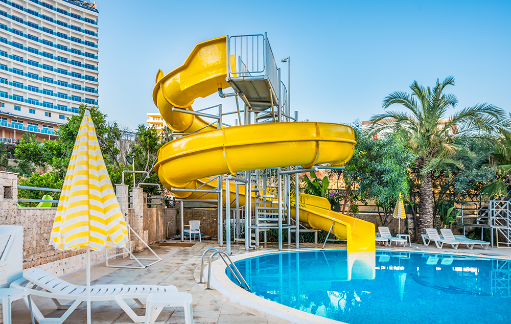 Hotelski sadržaj: Recepcija, glavni restoran, bar pored bazena, bazen za odrasle sa toboganom i odvojenim delom za decu, spa (tursko kupatilo, sauna i masaže-sve uz doplatu).