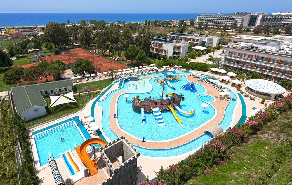Hotelski sadržaj: Recepcija, glavni restoran, a la carte restoran (jednom u toku boravka besplatno uz rezervaciju), 5 barova, poslastičarnica, bazeni za odrasle i decu, aqua park za odrasle i decu, mini club (4-12god), dnevna i večernja animacija za decu i odrasle, spa centar (teretana, hamam i parno kupatilo–sve besplatno), tereni za tenis, odbojka na pesku, vaterpolo, stoni tenis, pikaso, boćanje, joga, akva bik, bioskop na otvorenom, amfiteatar, wi fi (samo u lobiju besplatno).