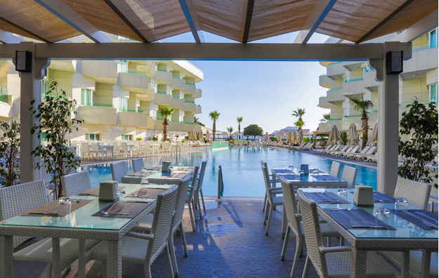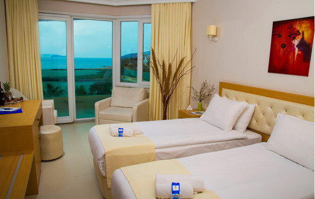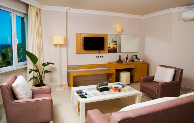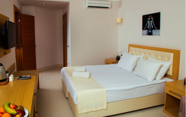 Sobe: Hotel ukupno ima 84 sobe. Standardne sobe su površine 17-23 m² i poseduju klima uredjaj, TV, tuš/wc, fen, mini bar, balkon, sef (besplatno), telefon, wifi. Suite sobe su površine od 45 m². Sastoje se od dve prostorije odvojene vratima i poseduju 2 kupatila. Isto su opremljene kao standard sobe. Mini bar je napunjen vodom i sokovima na dolasku.Maksimalno borave 4 odrasle osobe.