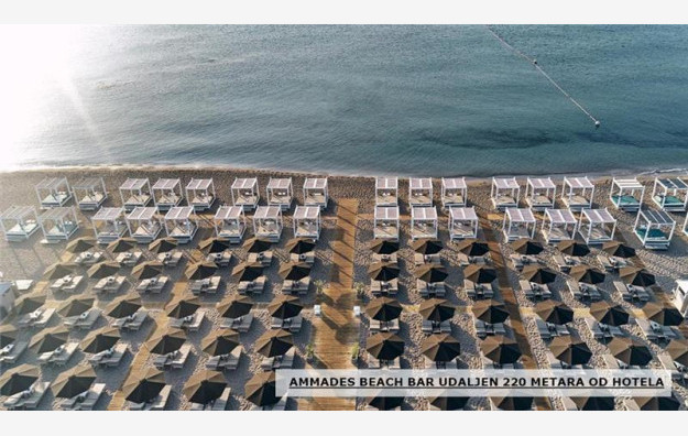 Smeštaj je lociran 220 metara od peščano-šljunkovite plaže, na kojoj se nalazi odličan beach bar „Ammades Seaside Restaurant and Bar“. Korišćenje ležaljki i suncobrana se doplaćuje.