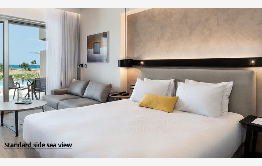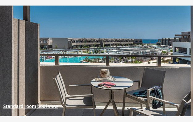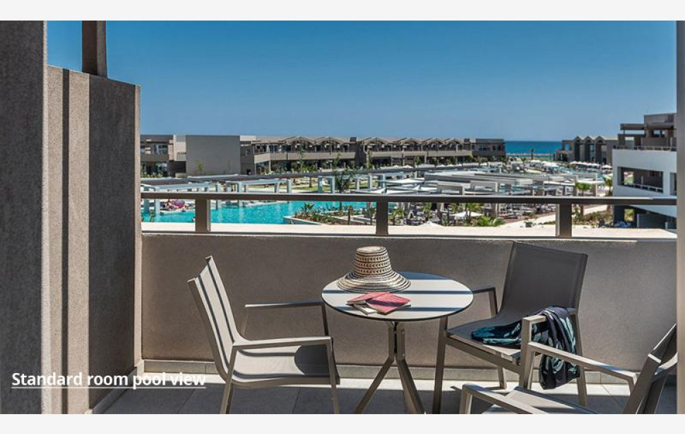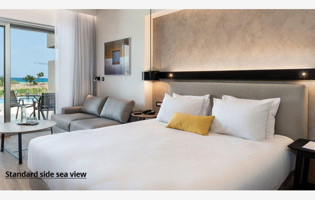 Sobe u svom sastavu imaju: SatTV-49“, direktnu telefonsku liniju, brzi Wi-Fi internet-besplatno, individualni klima uređaj, mini frižider-puni se vodom na dnevnom nivou, aparat za pravljenje čaja i kafe kao i espreso aparat, minibar, elektronski sef-besplatno, kupatilo sa tušem, fen za kosu, papuče, bade mantil, balkon ili terasa. U ponudi su tipovi soba: standard inland view, standard pool view, classic room sea view, standard sharing pool, dok junior suite pool view i junior suite sharing pool pružaju udoban smeštaj porodicama sa dvoje dece. Tip sobe standard inland view, standard pool view, classic room sea view, standard sharing pool površine je 30m2 i može da primi maksimum dve odrasle osobe i jedno dete i bebu ili tri odrasle sobe i bebu, sastoji se od francuskog ležaja ili dva singl ležaja i sofa na razvlačenje predviđene za treću osobu. Standard pool view soba ima pogled na glavni bazen, dok soba "standard sharing pool" ima izlazak na zajednički bazen. Soba „Junior suite pool view“ površine je 40 m2 i može da primi maksimum dve odrasle osobe i dvoje dece i bebu ili tri odrasle osobe, jedno dete i bebu. Ovaj tip sobe ima pogled na centralni bazen. Prostrana soba sa pogledom na glavni bazen hotela sastoji se od dva kreveta u jednoj prostoriji i još dve sofe u drugom delu sobe, odvojene paravanom, nudeci veću privatnost gostima. Tip sobe „Junior suite sharing pool“ ima izlaz na zajednički bazen i može da primi maksimum troje odraslih i jedno dete i bebu ili dvoje odraslih i dvoje dece i bebu, sadrži francuski ili dva singl ležaja i dve sofe na razvlačenje za potrebe treće i četvrte osobe. Sve gore navedene sobe su po svojoj osnovnoj strukturi dvokrevetne, dok ostali ležajevi mogu biti pomoćni. Bebi krevetac je na raspolaganju gostima besplatno (obavezna najava prilikom rezervacije).