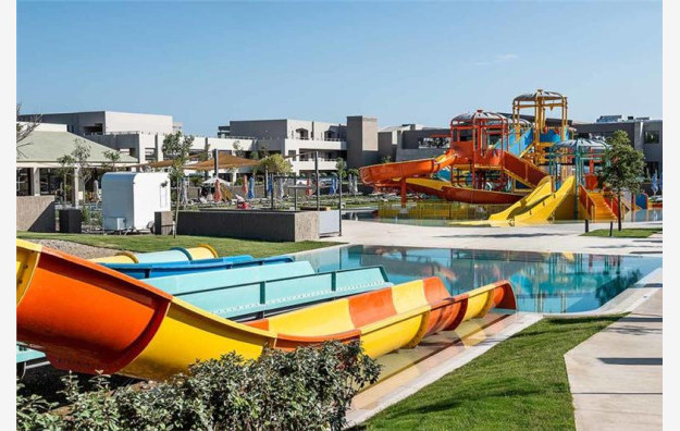 Hotelski kompleks sa akva parkom, na peščano-šljunkovitoj plaži.