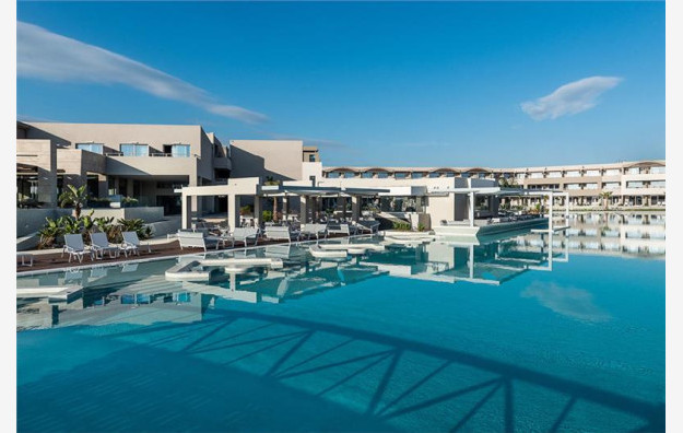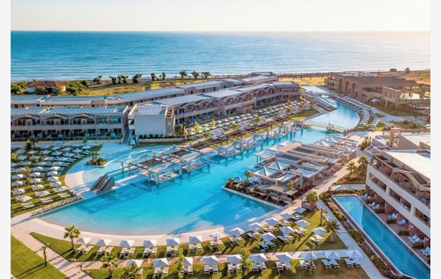 Hotelski kompleks sastoji se od 6 zgrada sa po dva sprata i ima ukupno 344 soba, inspirisan je idejom porodičnog odmora i svim gostima pružiće uslugu i sadržaje visokog kvaliteta. Od hotelskih sadržaja hotel poseduje pet restorana (tematski restorani jednom besplatno u toku boravka uz prethodnu rezervaciju), suvlaki snek kutak, glavni bazen jedan od najvećih u Grčkoj površine 3500m2, a la carte restoran pored bazena, lobi bar, 2 bara pored bazena, bar na plaži,, bazen za decu sa 4 tobogana, ležaljke i suncobrani na bazenu i plaži, peškiri za bazen i plažu, 2 fitness centra, Harmonia spa centar (sa zatvorenim bazenom, saunom, đakuzijem, parnim kupatilom) je za starije od 18 godina, teretana, stoni tenis, teniski teren i oprema-besplatno, bazen za bebe (3 meseca+), paket dobrodošlice svima po dolasku, parking. Veliki Akva park sa 4 tobogana i Vodenim tornjem je deo na koji je ovaj hotel posebno ponosan, jer je to mesto gde za najmlađe zabava počinje. Za decu raznih uzrasta, hotel ima dnevne aktivnosti kroz mini klub i igralište, a na raspolaganju je i servis za čuvanje dece i soba za igru. Animacija za odrasle je predviđena svakog dana. Hotel je prilagođen osobama sa invaliditetom.