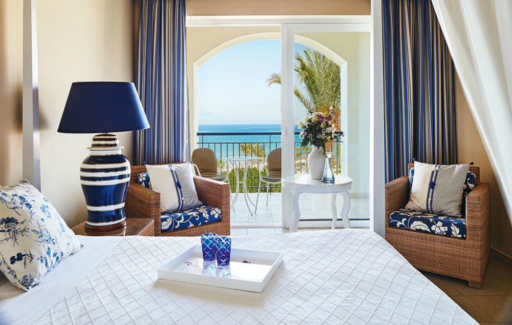 Superior guestroom sea view – oko 30m2, otvorenog plana, ove prozračne sobe imaju bračni krevet i dodatni krevet za jednu osobu, sa besprekornim pogledom na Jonsko more. Namenjene za 2-3 osobe.