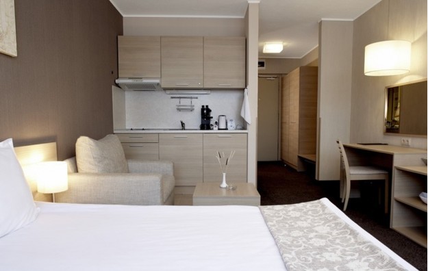 Smeštaj: Hotel raspolaže sa 102 luksuzno opremljenih studija i apartmana opremljenih, telefonom, SAT TV, internetom, sefom, opremljenom kuhinjom, kupatilom sa fenom.