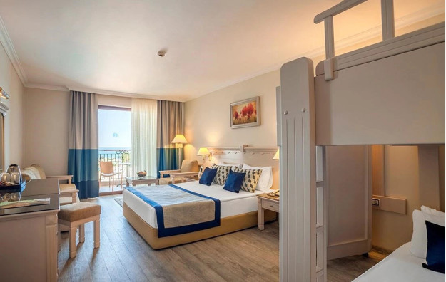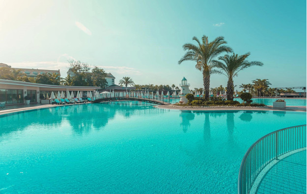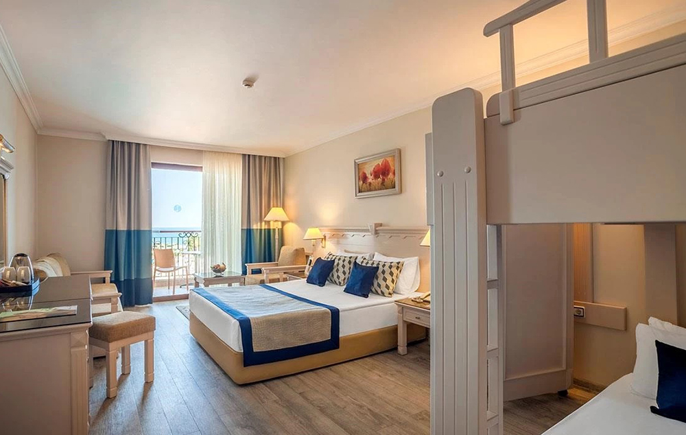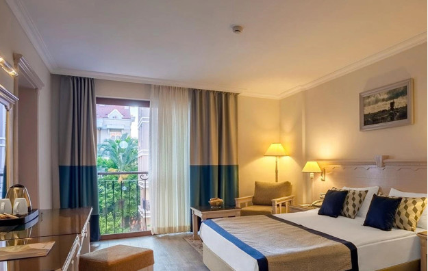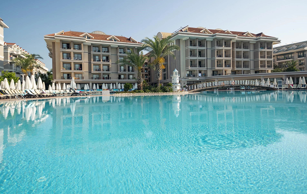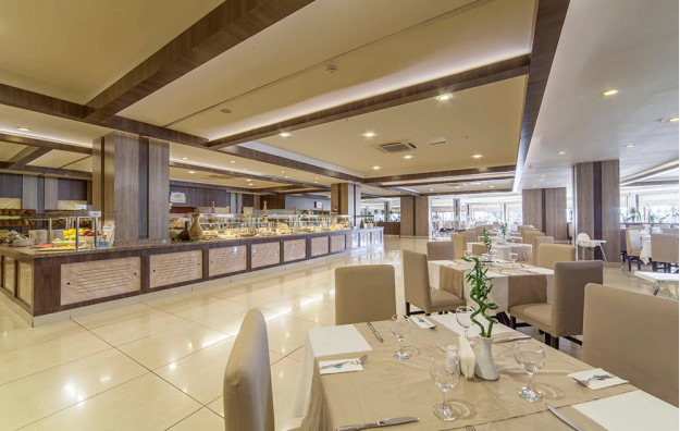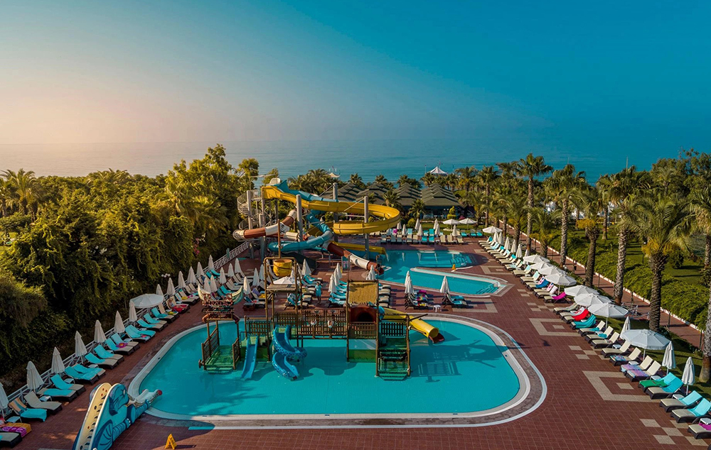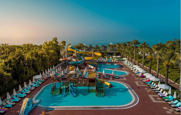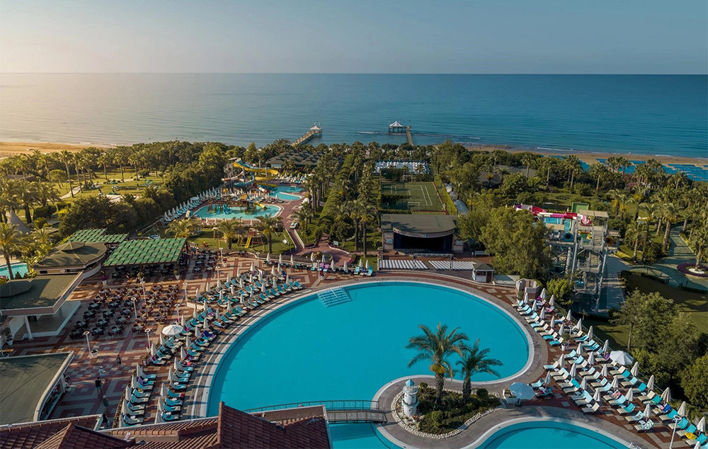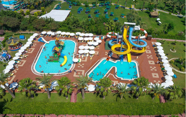 Hotelski sadržaj: Recepcija, glavni restorana, 3 a la carte restorana, poslastičarnica, 2 snack restorana, bistro, 11 barova, disko klub, dva otvorena bazena, bazen za decu, unutrašnji bazen, aqua park (3 tobogana za odrasle i 2 za decu), dečije igralište, dečiji meni, mini disko, mini klub (4-11 god), SPA centar (teretana, sauna, hamam-besplatno), dnevna i večernja animaciju za decu i odrasle, tematske večeri, muzika, teretana, teniski teren, streljaštvo, pikado, stoni tenis, odbojka na plaži, košarka, mini fudbal. Wifi je besplatan na celoj teriroriji hotela.