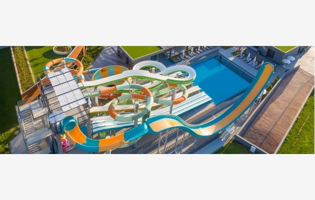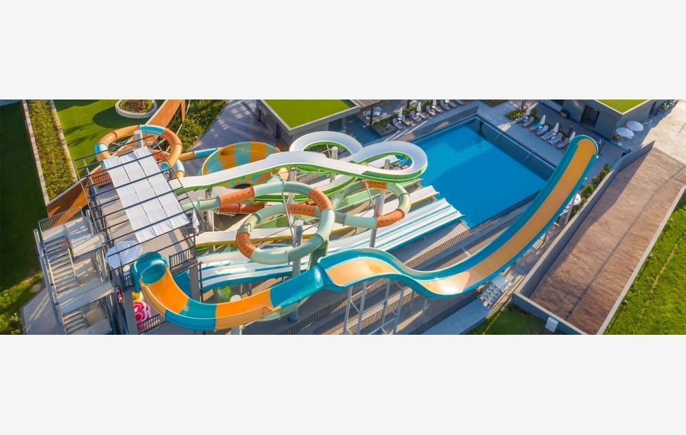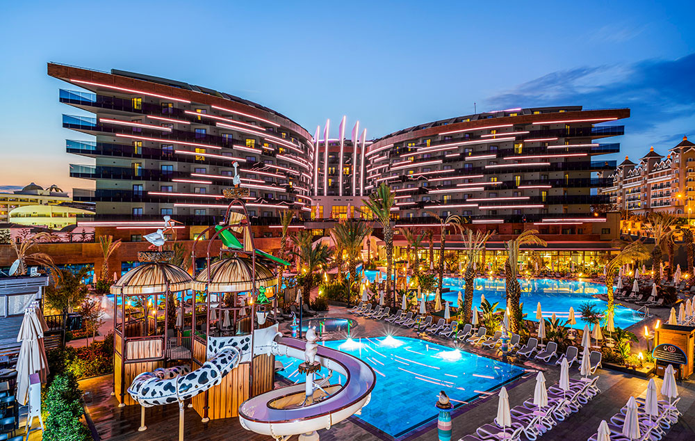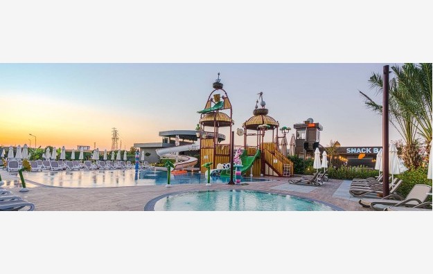 Hotelski sadržaj: recepcija, glavni restoran, 2 a la carte restorana (besplatno 1x tokom boravka, uz prethodnu rezervaciju), 2 snack bara, poslastičarnicu sa delom za sladoled, 8 barova (bar na plaži uključen), 1 otvoreni glavni bazen, 1 bazen sa 7 tobogana, 1 dečiji bazen, bazen za bebe, Spa centar (teretana, sauna, hamam – sve besplatno), mini klub za decu 4-12 godina, mini disco, igralište za decu, vaterpolo, Aquabik, boćanje, pikado, stoni tenis. Wi-fi je besplatan u celom hotelu.