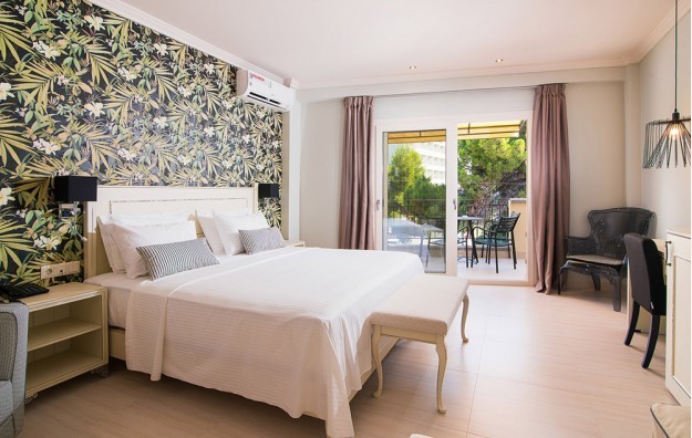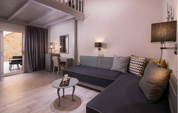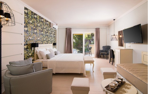 Deluxe Suite-33 m2, redefinišući porodično vreme, ovi apartmani imaju spavaću sobu otvorenog plana sa bračnim krevetom i 2 singl sofa za decu, namešteni balkon sa pogledom na okolinu i bazen i sopstveno kupatilo sa tušem.