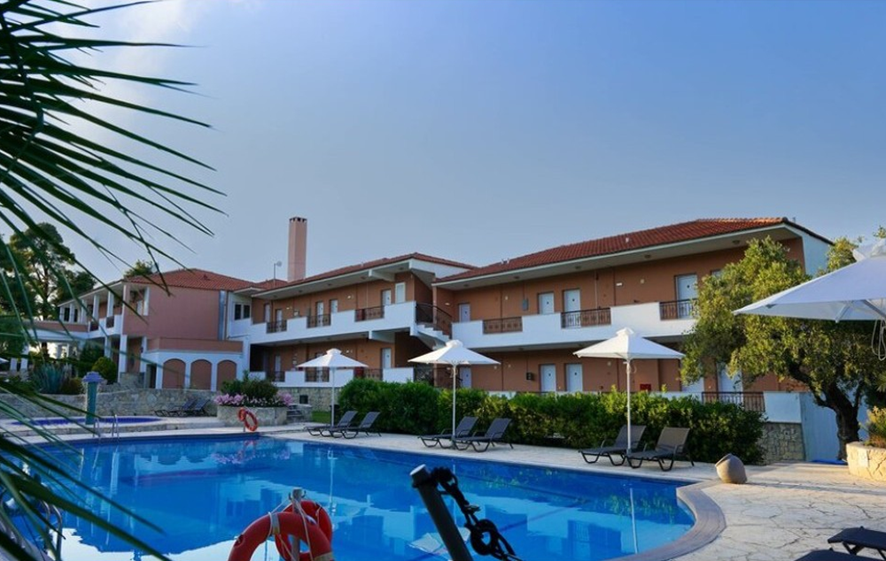 SADRŽAJ:mali porodični hotel smešten u lepo uređenom parku. Hotel poseduje bazen, ležaljke i suncobrane na bazenu, bazen za decu, dečije igralište, recepciju, besplatan Wi-Fi na recepciji, restoran, bar kraj bazena gde se organizuju grčke večeri, parking.