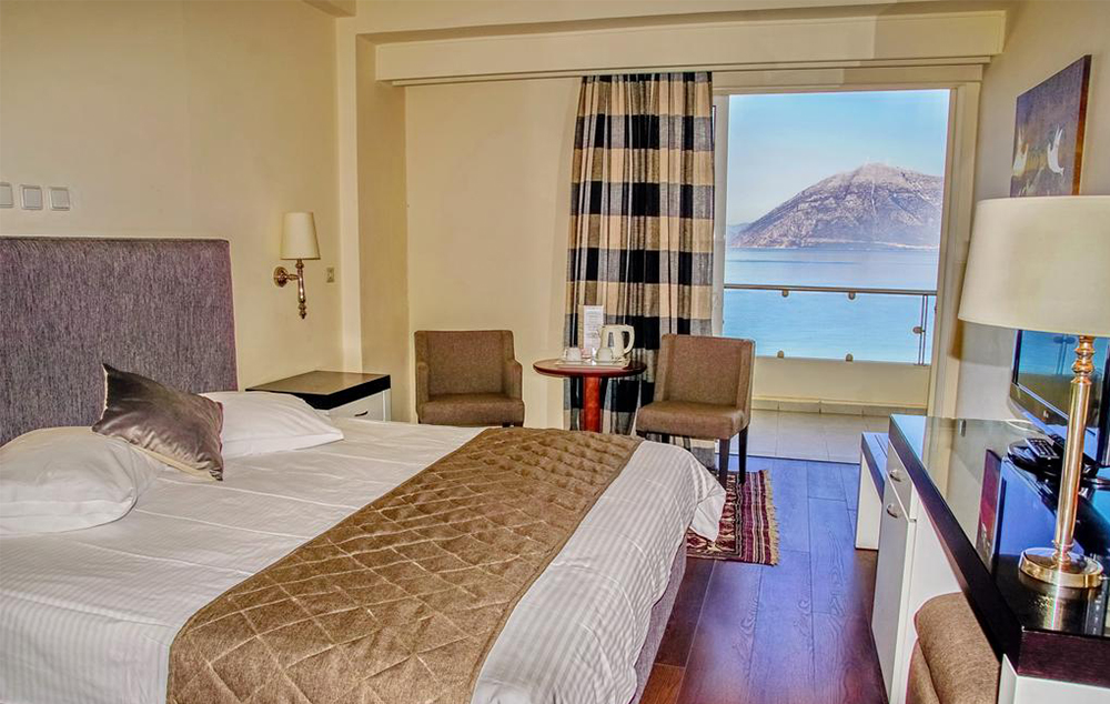 Double room side sea view (main building) - oko 22m2 sa fantastičnim pogledom na zaliv, most Rio i more sa strane, locirane su u glavnoj zgradi. Opremnjene su sa francuskim ili dva singl ležaja i sofom. Namenjena za 3 osobe.