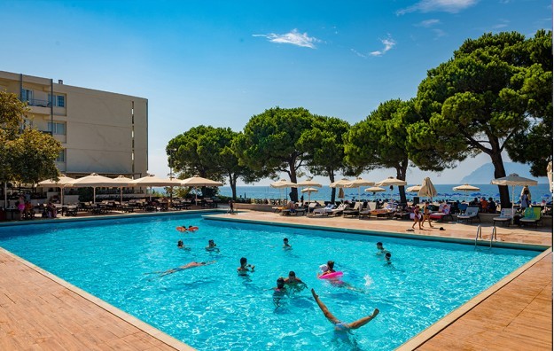 SADRZAJ Hotel raspolaže sa 225 funkcionalnih soba rasporedjenih u glavnoj zgradi i u Anexu. Recepcija - 24 h dnevno, bazen, dečiji bazen. ležaljke, suncobrani ( besplatno plaza, bazen) , bar na bazenu, snack bar, kafe, restoran , bašta, parking besplatno, teniski teren, igraliste za decu WIFI...