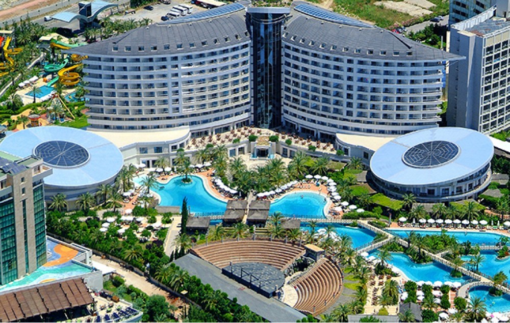 Hotelski sadržaj: Glavni restoran, 6 a la carte restorana, poslastičarnica, 2 snack bara, 10 barova (Gossip Bar - otvoren celu noć), otvoreni bazen, dva bazena sa toboganima za odrasle, 2 dečija bazena sa toboganima, unutrašni bazen za decu i odrasle, aqua park, luna park, dečija animacija, mini disko, dečije igralište, mini klub (4-12 god), SPA centar (sauna, tursko i parko kupatilo, đakuzi - besplatno), teretana, časovi plesa, step aerobik, stoni tenis, boćanje, odbojka na plaži, vodena gimnastika, vaterpolo, sportovi na vodi, pikado, teniski teren, mini fudbal, košarka. Wifi je besplatan u celom objektu.