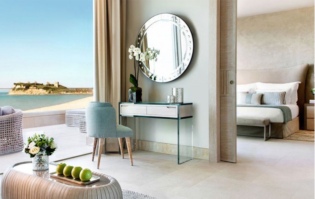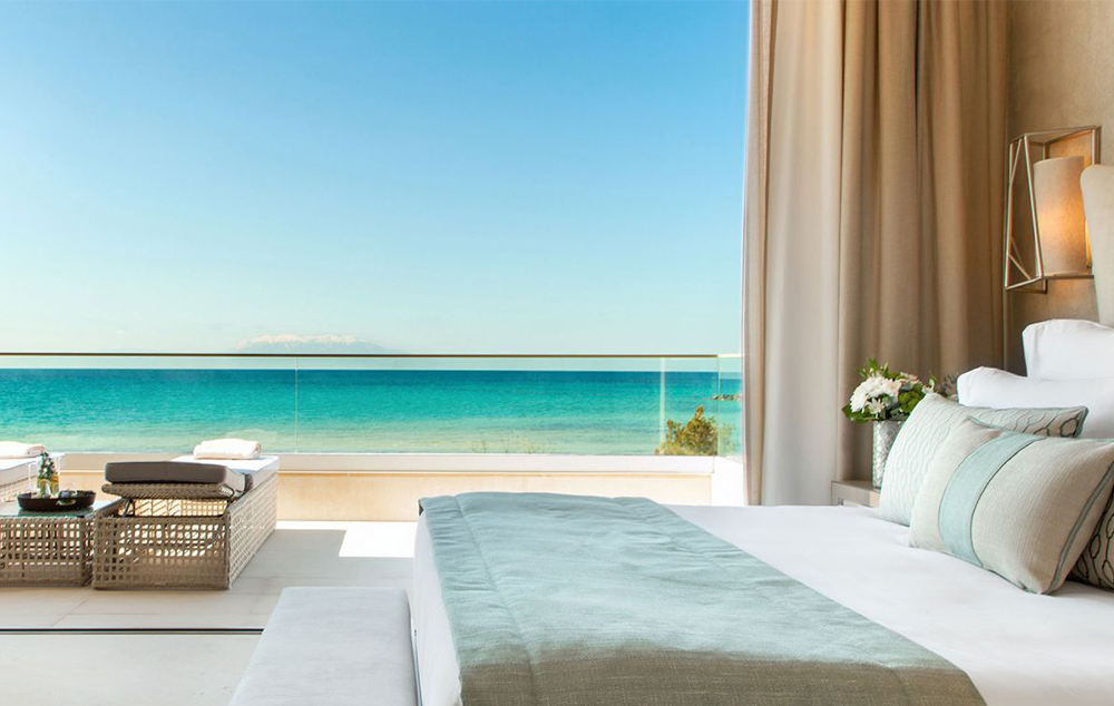 Deluxe One Bedroom Suite Grand Balcony Sea View-Izuzetno prostran apartman, koji nudi spektakularan pogled na Egejsko more. Impresivan unutrašnji prostor upotpunjen je opuštajućom verandom sa luksuznim nameštajem. Prostrano kupatilo ima kadu i tuš kabinu sa svime što je potrebno za podmlađivanje, uključujući ekskluzivne pogodnosti Anne Semonin. Deluks apartmani sa jednom spavaćom sobom imaju unutrašnja klizna vrata, koja odvajaju spavaću sobu od prostora za sedenje radi dodatne privatnosti. Balkon sa luksuznim nameštajem, stolićem i stolicama, popločan pod, unutrašnji prostor 51m2 / balkon cca. 30m2.