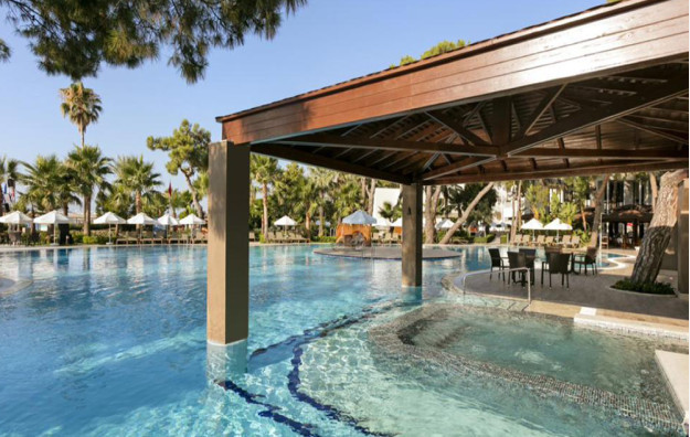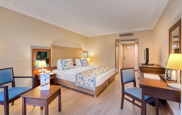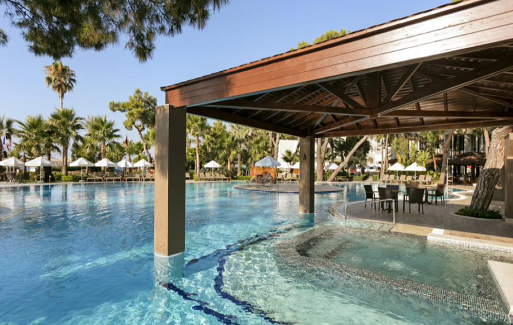 Hotelski sadržaj: Recepcija, glavni restoran, 4 a la carte restorana, 5 barova, disco klub (pića besplatno), dečji restoran, Kids world klub (1830m2), 3 bazena za odrasle (jedan sa 3 tobogana, 2 bazena za decu, 1 baby bazen, 2 teniska terena, stoni tenis, odbojka na plaži, košarka, pikado, sportovi na vodi, vaterpolo, mini fubdal, boćanje, streljaštvo, pojedine kompjuterske igrice, Spa centar (teretana, hamam, sauna i parno kupatilo-sve besplatno), masaže (uz doplatu), dvevna i večernja animacija. Wifi je besplatan na celoj teritoriji hotela.