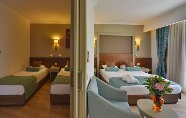 Family sobe pogled kopno ili bazen (45m2). Sastoje se od dve spavaće sobe. U jednoj prostoriji je francuski ili dva odvojena ležaja, u drugoj dva odvojena ležaja. Maksimalno mogu da borave četiri odrasle osobe.