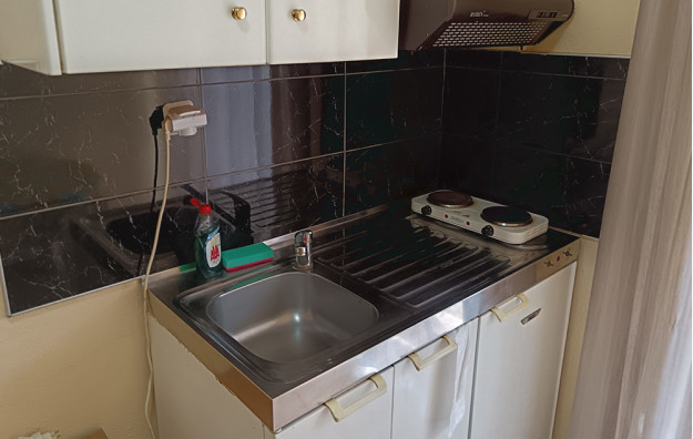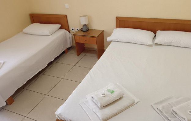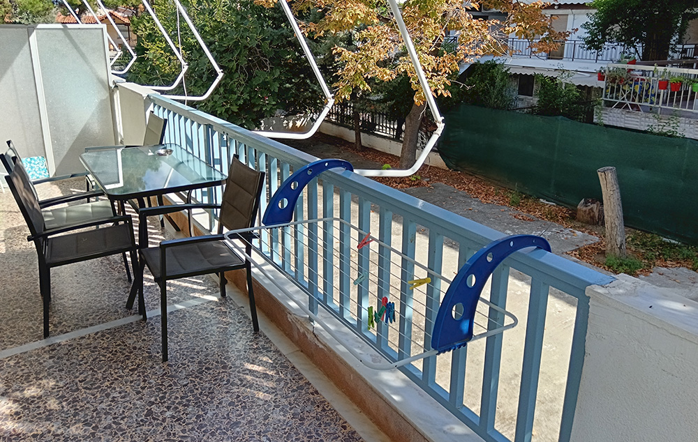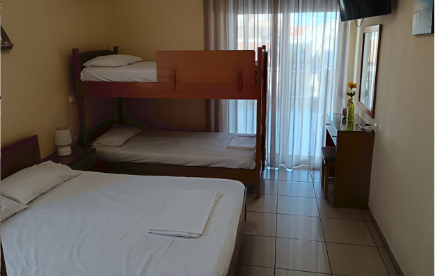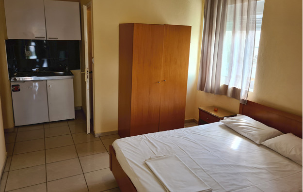 Vila Stelios je starijeg datuma i sastoji se od četvorokrevetnih apartmana na visokom prizemlju i studija na prvom spratu. Nalazi se u centru letovališta na oko 80 metara od mora. Dvokrevetni, trokrevetni i četvorokrevetni apartmani na visokom prizemlju sadrže kuhinju sa trpezarijskim stolom i jednim standardnim ležajem, spavaću sobu sa francuskim i standardnim ležajem, kupatilo sa tuš kadom i veliku natkrivenu terasu sa garniturom za sedenje i pogledom na dvorište. Veličina apartmana je cca 25 kvm + terasa. Opremljen je sa wi – fi Internetom, TV-om, mrežom za komarce i klima uredjajem (uključen u cenu) u spavaćoj sobi. Četvorokrevetni studio na prvom spratu sadrži kuhinjski deo, francuski ležaj i dva standardna ležaja na sprat, kupatilo sa tuš kadom i veliku natkrivenu terasu sa garniturom za sedenje i bočnim pogledom na more. Veličina studija je cca 24 kvm + terasa. Opremljen je sa wi – fi Internetom, TV-om, mrežom za komarce i klima uredjajem (uključen u cenu). Ono što posebno izdvaja ovaj studio i čini ga izuzetno atraktivnim i interesantnim, je velika ugaona terasa (oko 15 kvadrata), sa prelepim bočnim pogledom na more. Vila Stelios je B kategorije, nema peškire, a parkiranje je moguće na ulici pored vile.