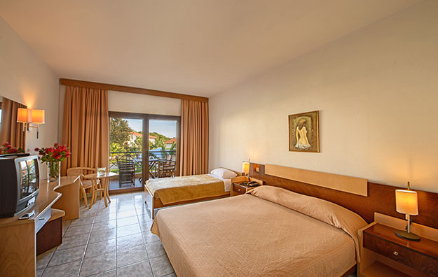Superior Triple Room- oko 30-35m2 sa pogledom na more, opremnjena je sa francuskim ili 2 singl ležaja I sofom. Namenjena je za 2-4 osobe.