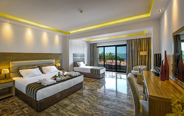 Superior Room-oko 30-35m2 sa pogledom na more, opremnjena je sa francuskim ili 2 singl ležaja I sofom. Namenjena je za 2-3 osobe.