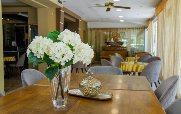 Opis: U našoj ponudi su dvokrevetna, trokrevetna i četvorokrevetna studija, smeštena na prvom i četvrtom spratu. Svaki poseduje opremljen kuhinjski deo, kupatilo/wc, terasu, TV, WiFi internet i klima uređaj (uključen u cenu aranžmana). Objekat poseduje recepciju, lift, loby bar, roof garden, a ispred hotela je park. U hotelu je čišćenje svakodnevno, promena peškira svakog drugog dana. U ponudi su usluga najma ili polupansiona (doručak-na bazi švedskog stola, večera-menu).