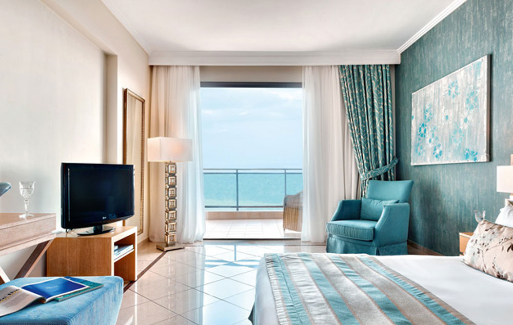 Junior Suite Sea View-35 m², Prostran i elegantan apartman s kombinovanom spavaćom sobom i dnevnim boravkom. Prošireno kupatilo ima kadu ili tuš, dok namešteni balkon ili terasa pružaju prekrasan pogled na more.