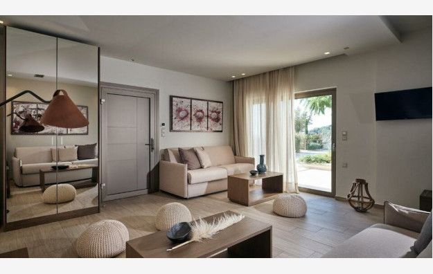 Deluxe Suite with Side Sea View - 35-40 m2, udoban apartman s odvojenom spavaćom sobom s bračnim krevetom i dnevnim boravkom s kaučem na razvlačenje, sopstvenim kupatilom sa tušem i nameštenim balkonom s bočnim pogledom na Jonsko more.