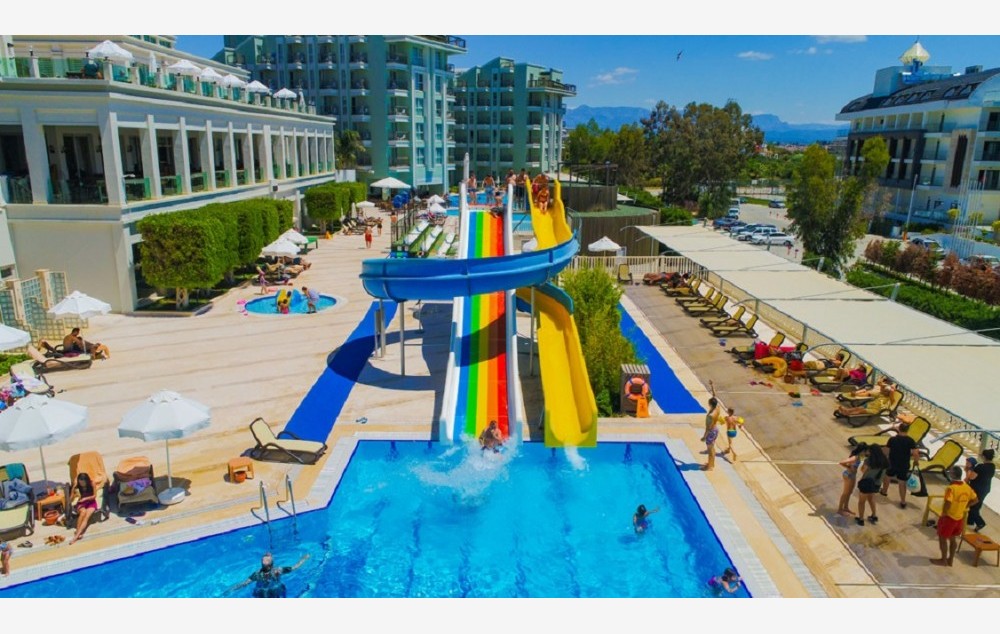 Sadržaj: Glavni restoran na bazi otvorenog bufe-a, A'la Carte restorani (mediteranski, turski, meksički , italijanski), barovi u okviru hotelskog kompleksa, disko klub. Otvoreni i zatvoreni bazeni za decu i odrasle, tobogani, fitnes centar, tursko kupatilo, sauna, odbojka na plaži, zabavni programi tokom dana, takmičenja, večernji programi za odrasle, mini klub za decu od 4 do 12 godina sa dnevnim i večernjim programima.