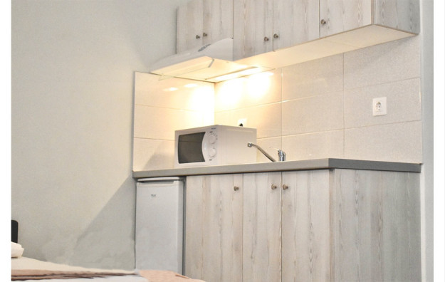 Opis: U našoj ponudi su studija i dupleks apartmani, koji se nalaze na prvom spratu. Sve smeštajne jedinice su renovirane. Svaki studio/dupleks ima opremljenu kuhinju, kupatilo/wc, terasu, TV, WiFi internet, klima uređaj (uz doplatu na licu mesta, od 7€ dnevno).