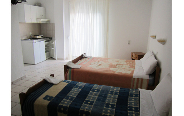 Dvokrevetni i trokrevetni studiji (STD 1/2, STD 1/3) se sastoje od dela za spavanje, sa manjim francuskim (francuski ležaj po grčkim standardima-120 cm) ili 2 ležaja (u std 1/2), ili manjim francuskim (francuski ležaj po grčkim standardima-120 cm) i jednim ležajem (u std 1/3), kuhinjskog dela (sa mikrotalasnom), kupatila i lepe terase sa garniturom za sedenje. Veličina studija je cca 25 kvm + terasa.