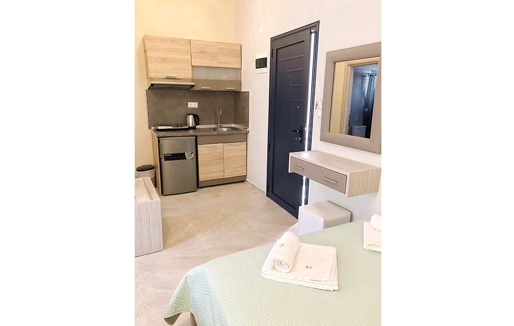 Opis: Vila raspolaže sa moderno opremljenim, dvokrevetnim studijima, koji se nalaze na prvom spratu. Svaka smeštajna jedinica ima kompletno opremljenu kuhinju, kupatilo/wc, terasu, TV, WiFi internet i klima uređaj (uz doplatu na licu mesta od 6€ dnevno).