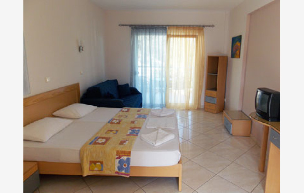 Dvokrevetni, dvokrevetni + 2 i trokrevetni studiji (1/2 STD, 1/3 STD, 1/2+2 STD) se nalaze na prizemlju sa direktnim izlaskom u vrt, prvom i drugom spratu i sastoje se od velikog prostora u kojem je smeštena opremljena kuhinja, dva spojena ležaja i sofa na otvaranje (za odraslu osobu i dete ili dvoje dece do 12 godina), kupatila i velike terase s garniturom za sedenje. Svi studiji su sa klima uredjajem (uračunat u cenu 24.07. - 18.08., u ostalim terminima se doplaćuje na licu mesta (opcija), 6 eur dnevno po studiju), LED TV-om 28 inča (RTS) i wi – fi Internetom (uz doplatu na licu mesta (opcija) 2 eura dnevno). Veličina studija je cca 25 kvm + terasa.