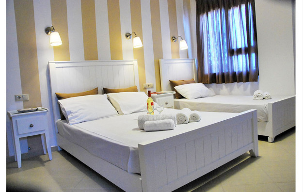 Opis:Trokrevetni i četvorokrevetni apartmani (1/3 APP, 1/4 APP) sastoje se od dve spavaće sobe (od kojih se kroz jednu ulazi u apartman, ima dva standardna ležaja ili francuski i bez vrata ka prolaznoj kuhinji, a druga ima izlaz na terasu i ima francuski ležaj ili dva standardna), male kuhinje, kupatila i velike terase sa garniturom za sedenje sa bočnim pogledom na more, okrenute prema maloj ulici i plaži.Svi apartmani su opremljeni klima uredjajem (uz doplatu na licu mesta (opcija), 8 eur dnevno po apartmanu), wi – fi Internetom i TV - om. Veličina apartmana je cca 35 kvm + terasa.Vila Rigakis Mol je B kategorije, nema peškire i nema mogućnost sopstvenog parkinga.