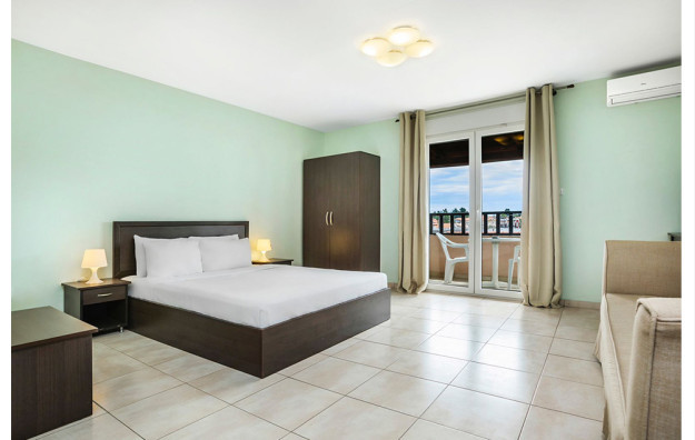 Opis: Studiji i apartmani se nalaze na visokom prizemlju i na prvom spratu i opremljeni su klima uredjajem (uključeno u cenu aranžmana u julu i avgustu - uz doplatu na licu mesta (opcija) maj, jun i septembar, 8 eur dnevno po studiju/apartmanu) wi – fi Internetom i SAT TV. Peškiri su uključeni u cenu.Dvokrevetni, trokrevetni i dvokrevetni + 2 (STD 1/2, STD 1/3, STD 1/2+2), prostrani studiji, sadrže opremljenu kuhinju, deo za spavanje sa francuskim ležajem, sofom 180 x 75 cm i ležajem na izvlačenje (190 x 75 cm, skoro kao standardni) i kupatilo. Veličina studija je cca 25 kvm + terasa.Dvokrevetni manji studiji (1/2 STD PROMO - max 2 osobe) se razlikuju od prethodno opisanih u tome što imaju samo manji francuski ležaj i veličine su cca 15 - 18 kvm + terasa.Četvorokrevetni apartmani (1/4 APP) sadrže opremljenu kuhinju koja je pultom odvojena od dnevnog boravka u kojem se nalaze dva ležaja, spavaću sobu sa francuskim ležajem i kupatilo. Veličina apartmana je cca 35 kvm + terasa.Četvorokrevetni i petokrevetni, lepi porodični apartmani (1/4 FAM APP, 1/5 FAM APP), imaju pogled na na obe strane hotela i sastoje se od dela sa opremljenom kuhinjom, francuskog ležaja, sofe i ležaja na izvlačenje (190 x 75 cm, skoro kao standardni), male, lepo dekorisane dečje sobe (odvojene „harmonika” vratima) u kojoj su ležajevi na sprat (skoro kao standardni) za dvoje dece do 12 godina i kupatila. Veličina apartmana je cca 30 kvm + terasa.Na novijem, drugom spratu, nalaze se lepo i moderno dizajnirani studiji i apartmani iz kojih se bočno, sa terase vidi more.Dvokrevetni, prostrani studiji (1/2 STD) sadrže opremljenu kuhinju, deo za spavanje sa francuskim ležajem i kupatilo.Trokrevetni studiji (1/3 STD), (nešto manji nego na prizemlju i I spratu) sadrže opremljenu kuhinju, deo za spavanje sa francuskim i standardnim ležajem i kupatilo. Veličina studija je cca 20 kvm + terasa.Dvokrevetni + 2 studiji (1/2+2 STD), sadrže opremljenu kuhinju, deo za spavanje sa francuskim ležajem, sofom 180 x 75 cm i ležajem na izvlačenje (190 x 75 cm, skoro kao standardni) i kupatilo. Veličina studija je cca 25 kvm + terasa.Četvorokrevetni i petokrevetni, lepi porodični apartmani (1/4 FAM APP, 1/5 FAM APP), imaju pogled na obe strane hotela i sastoji se od opremljene kuhinje, male, lepo dekorisane dečije sobe (povezane sa kuhinjom, bez vrata) u kojoj su ležajevi na sprat (skoro kao standardni) za decu do 12 godina, spavaće sobe sa francuskim ležajem, sofom 180 x 75 cm ili ležajem na izvlačenje (190 x 75 cm, skoro kao standardni) i kupatila. Veličina apartmana je cca 30 kvm + terasa. Svi studiji i apartmani imaju lepe terase sa garniturom za sedenje.U vili Poseidon, viskoko prizemlje i prvi sprat su kategorisdani kao B kategorija, a drugi, noviji sprat kao A kategorije, nema peškire i nema mogućnost sopstveng parkinga.