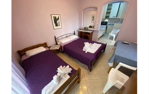 Opis: Raspolaže studijima i dupleks apartmanom namenjenim za smeštaj od dve do četiri osobe, koji se nalaze na visokom prizemlju i prvom spratu. Sve smeštajne jedinice imaju kuhinjski deo, WiFi, TV, kupatilo/wc, veš mašinu, terasu i klima uredjaj ( uključen u cenu aranžmana ). Promena posteljine i peškira je jednom tokom boravka.