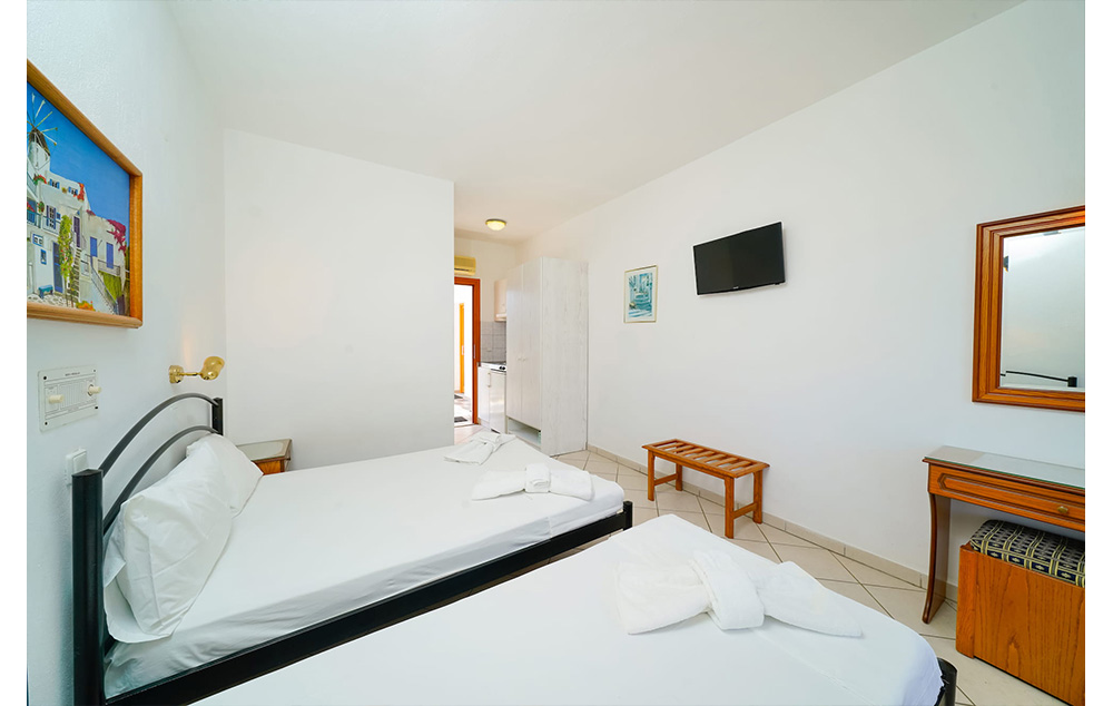 U našoj ponudi su dvokrevetna I trokrevetna studija u vrtu, desno od bazena, u spuštenom prizemlju, sa uslugom dnevnog čišćenja studija. U neposredoj blizini hotela se nalazi javni, besplatni parking.