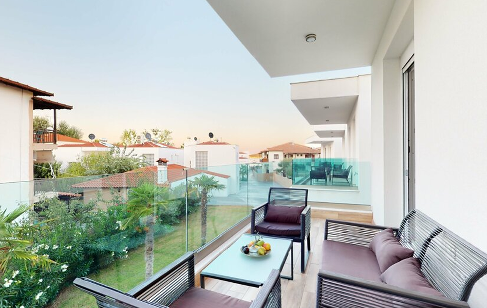 3 - bedroom villa- 100 m², prostire se na tri etaže (2 sprata) s 2 spavaće sobe i 2 kupatila na spratu i 1 spavaćom sobom s kupatilom na srednjoj etaži, udobnim dnevnim boravkom i prostranom trpezarijom s kuhinjom u prizemlju, s direktnim pristupom nameštenoj verandi s prekrasnim pogledom na zalazak sunca.