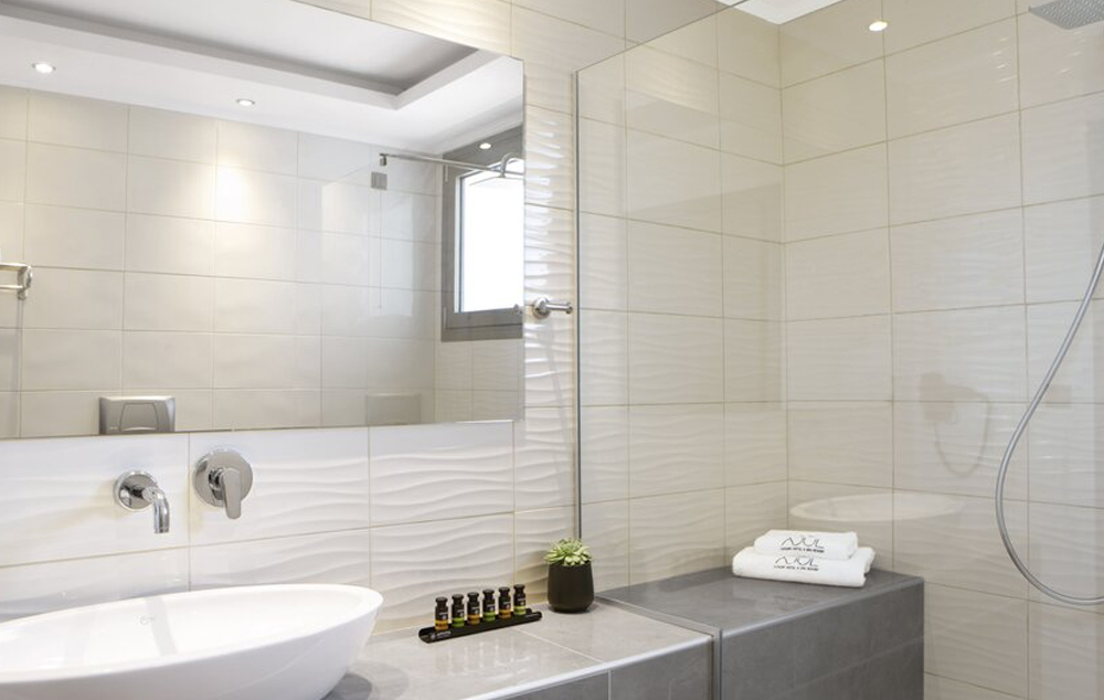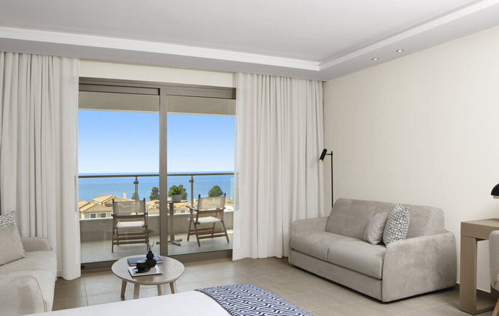 Deluxe Room Sea View - Apartman površine 25 m², smešten u glavnoj zgradi, ima bračni ili dva odvojena kreveta i kauč na razvlačenje za treću osobu (bebe dele krevet s roditeljima), sopstveno kupatilo s tušem i namešten balkon s pogledom na more.