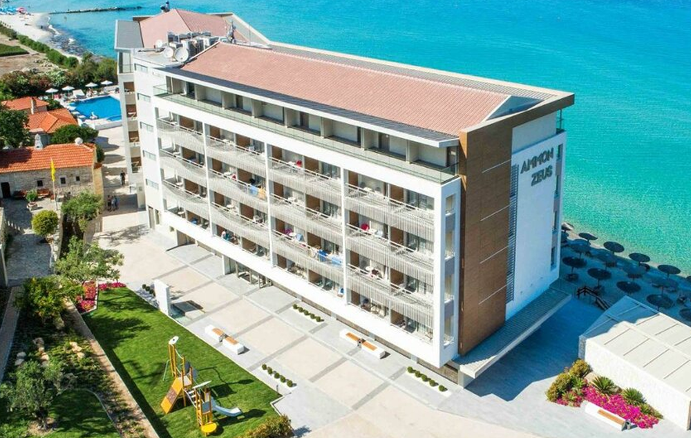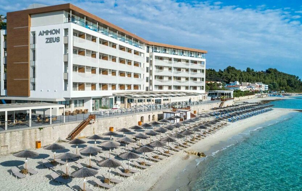 LOKACIJA: na prvom prstu Halkidikija, u mondenskom letovalištu Kalitea, na samoj plaži. Ammon Zeus se nalazi tik pored ostataka antičkog svetilišta Ammon Zeus, na samoj obali mora, udaljen samo par minuta od centra Kalitee. Plaža na kojoj se nalazi nosi plavu zastavicu Mediterana za najčistije more. Sa hotelskih balkona vidi se prelepa panorama Egejskog mora i zelenilo ove brdovite regije. U okviru hotela nalazi se i mala crkva koja datira iz 18. veka. Blizina kosmpolitskog gradića Kalitea omogućava gostima da uživaju u svim prednostima letovališta, kao i u miru i tišini hotela. Hotel je od renoviran 2018. i u svakoj od 126 soba je dostupan mini bar, televizor, klima uredjaj, telefonska linija i fen za kosu.