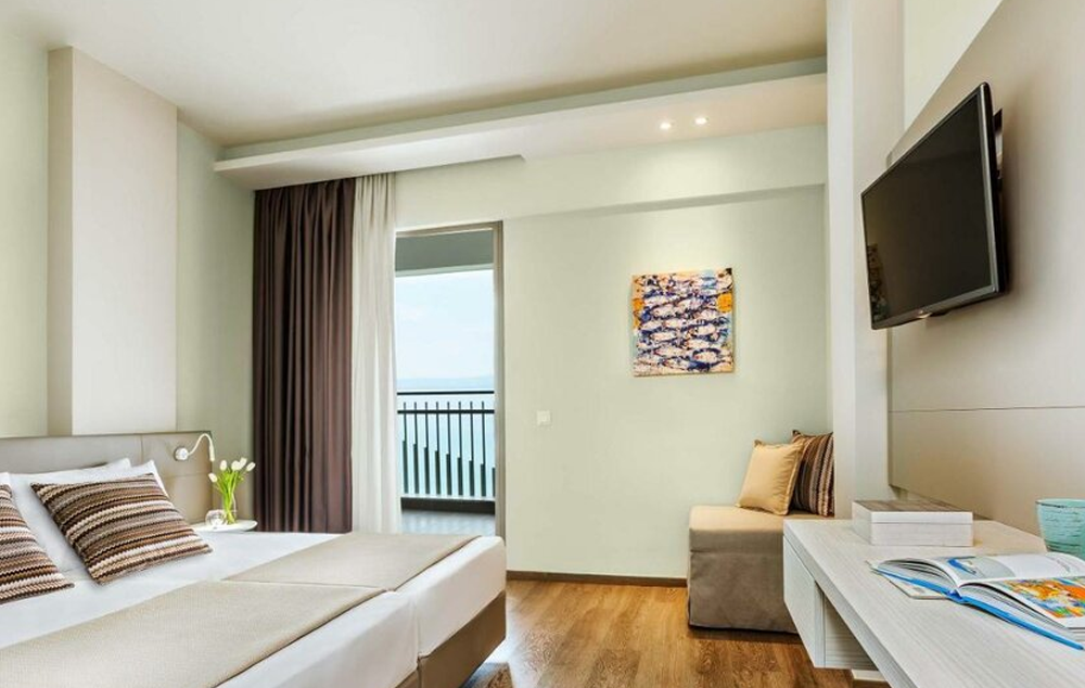 Premium Room Sea Front- Sobe od 21 m² s prekrasnim pogledom na more, bračnim ili dva odvojena kreveta i kaučem na razvlačenje za treću osobu, nameštenim balkonom i sopstvenim kupatilom s tušem.