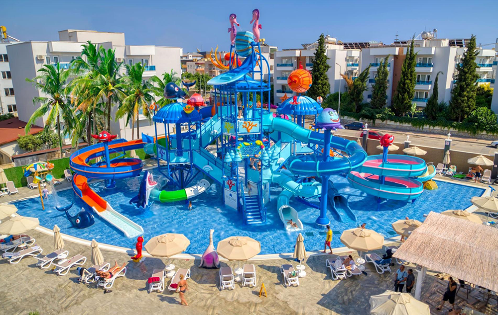 Hotelski sadržaj: Recepcija, 2 glavna restorana, 2 a la carte restorana, dijetalni meni, 13 barova, 2 unutrašnja i 5 spoljašnjih bazena, 5 dečijih bazena, 6 đakuzija, akva park sa 19 tobogana (10 dečijih), bioskopska sala, dnevne i večernje animacije, mini klub (za decu od 4-12 godina), teenage klub (za decu od 13-17 godina), mini disko, igraonica, aerobic u vodi, bocanje, pikado, stoni tenis, odbojka na pesku, teniski teren, košarka, tursko veče, hamam, sauna, parna soba, teretana, bilijar (uz doplatu), wi fi (u lobiju).
