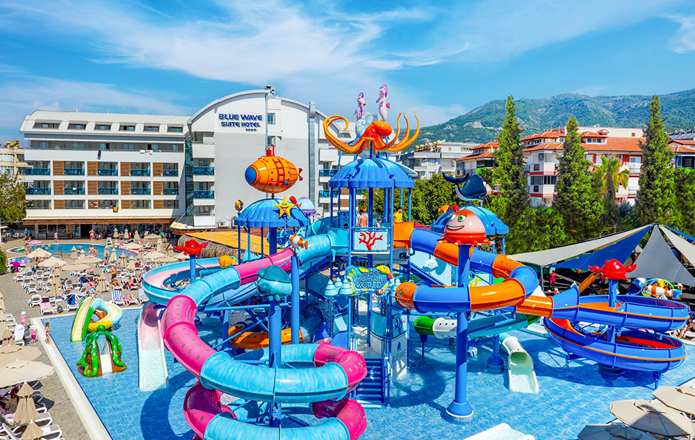 Hotelski sadržaj: Recepcija, lift, 2 restorana, lobby bar, bar pored bazena, dva otvorena bazena sa toboganima i odvojenim delom za decu, frizer, mini market, wi fi beplatno u zajedničkim prostorijama.