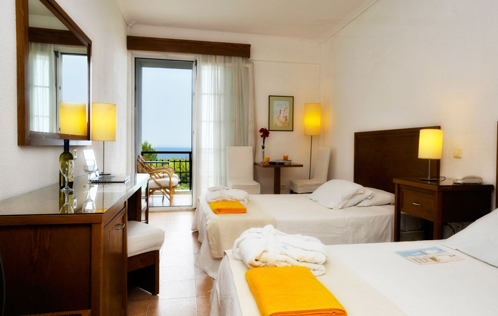 Sea View Room- 22 m2, nalazi se u glavnoj zgradi na gornjim spratovima, sa prekrasnim pogledom na more, ima bračni ili dva odvojena kreveta, sopstveno kupatilo sa tušem i nameštenu terasu sa pogledom na more.