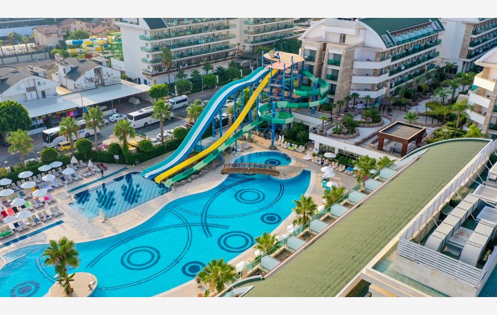 Hotelski sadržaj: Recepcija, 2 glavna restorana, 2 a la carte restorana, dijetalni meni, 13 barova, 2 unutrašnja i 5 spoljašnjih bazena, 5 dečijih bazena, 6 đakuzija, akva park sa 19 tobogana (10 dečijih), bioskopska sala, dnevne i večernje animacije, mini klub (za decu od 4-12 godina), teenage klub (za decu od 13-17 godina), mini disko, igraonica, aerobic u vodi, bocanje, pikado, stoni tenis, odbojka na pesku, teniski teren, košarka, tursko veče, hamam, sauna, parna soba, teretana, bilijar (uz doplatu), wi fi (u lobiju).