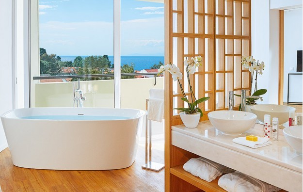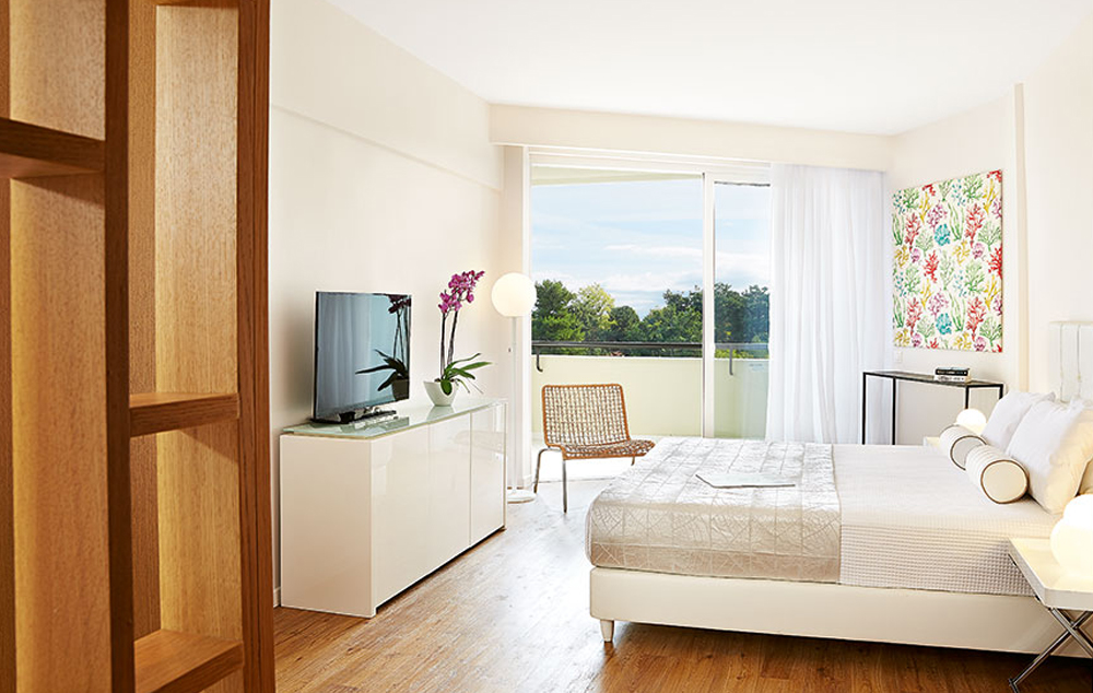 Ivory Junior Suite- 34 m², šik i prostran apartman otvorenog tipa s bračnim krevetom i sopstvenim kupatilom s tušem i samostojećom kadom, smešten na gornjim spratovima glavne zgrade, s prekrasnim bočnim pogledom na more s nameštenog balkona.