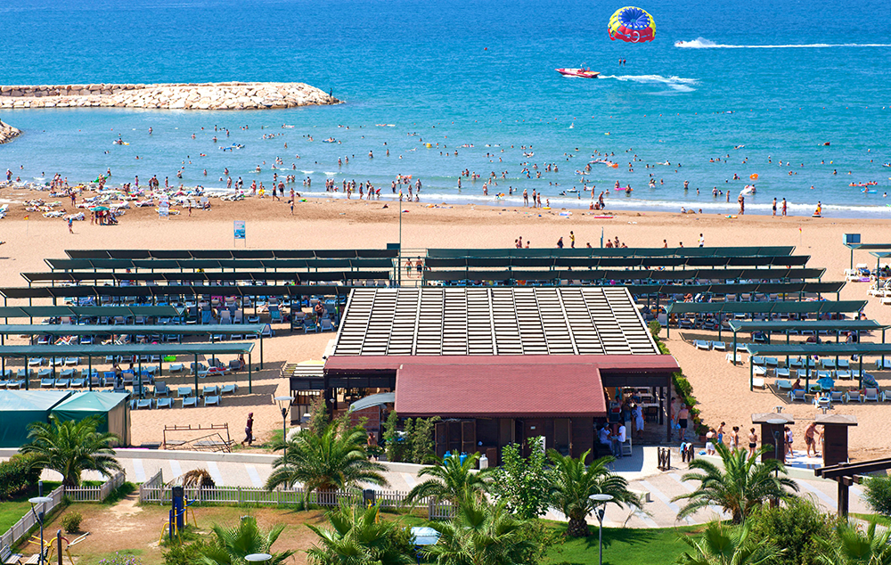 Plaža: Hotelska, peščano–šljunkovita plaža, udaljena je od hotela oko 250m (prelazi se prometna ulica, takođe postoji podzemni prolaz do plaže). Ležaljke i suncobrani na plaži su besplatni.