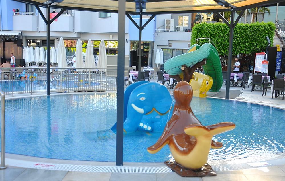 Hotelski sadržaj: Recepcija, glavni restoran, a la carte restoran, bar pored bazena, bar na plaži, bazen za odrasle, dečiji bazen, dva tobogana, dečije igralište, dnevnu animaciju, večernji mini disko, fitness, tursko kupatilo, saunu, stoni tenis, bilijar, wi fi se doplaćuje.