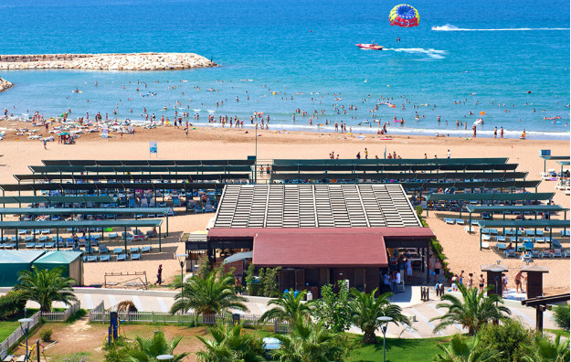 Plaža: Hotel poseduje sopstvenu peščano-šljunkovitu plažu koja se nalazi na 500m udaljenosti od hotela (postoji podzemni tunel). Za goste hotela ležaljke i suncobrani su besplatni, peškiri uz doplatu. Bar na plaži uz doplatu.
