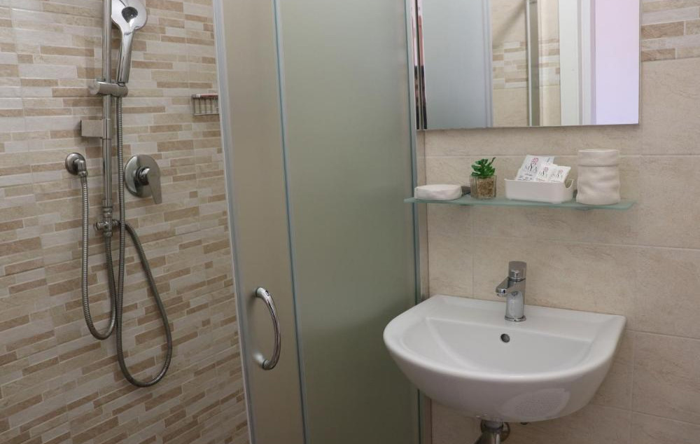 Comfort room- u glavnoj zgradi , sa tuš-kabinom i bočnim pogledom na more